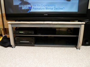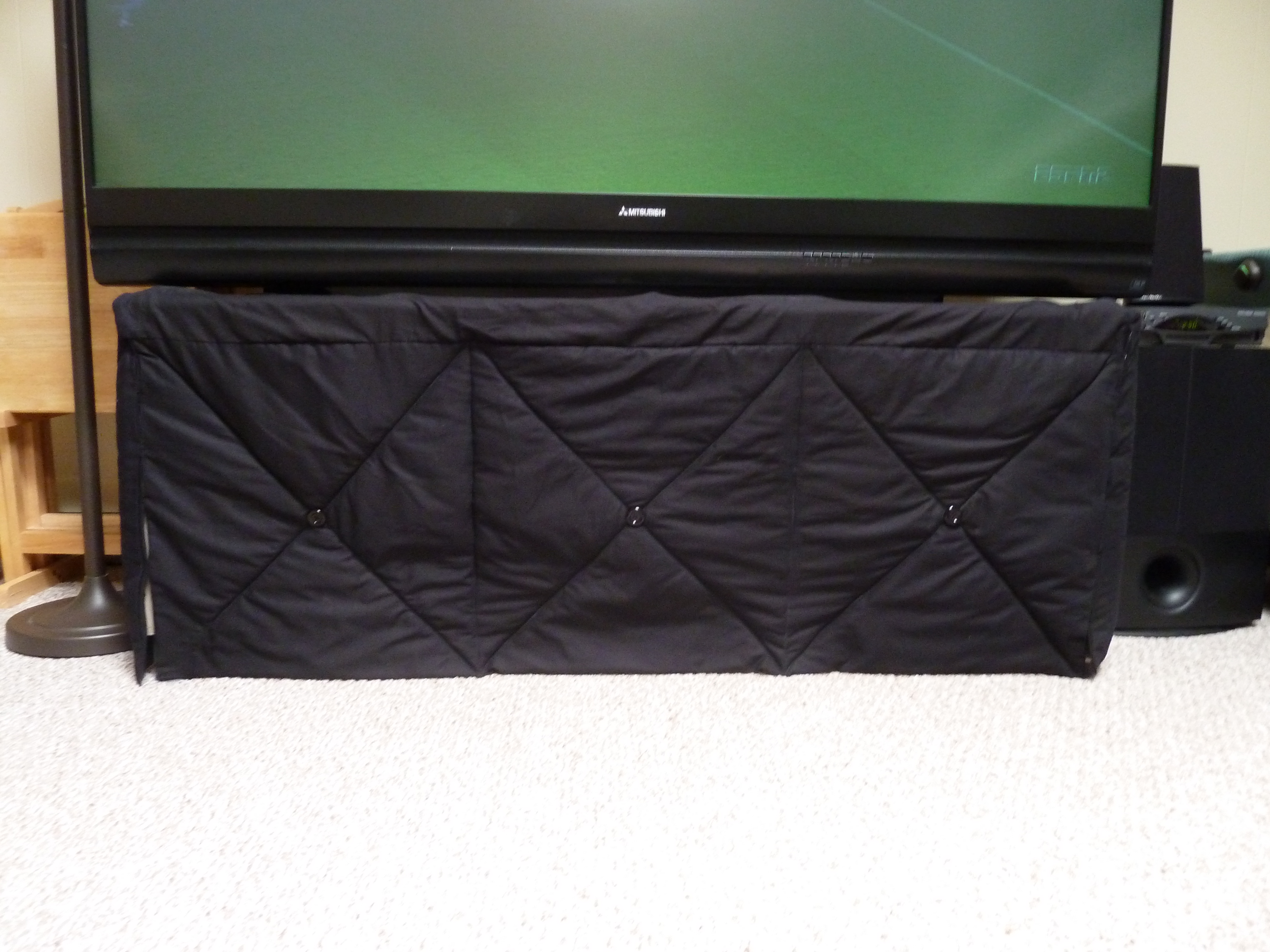 I wanted a cohesive look for the tv stand and knew this was going to be temporary.  My MIL found the tan cushions that provided great cushion on the corners of the stand but we still needed something to cover the glass shelves otherwise this was going to turn into her jungle gym.