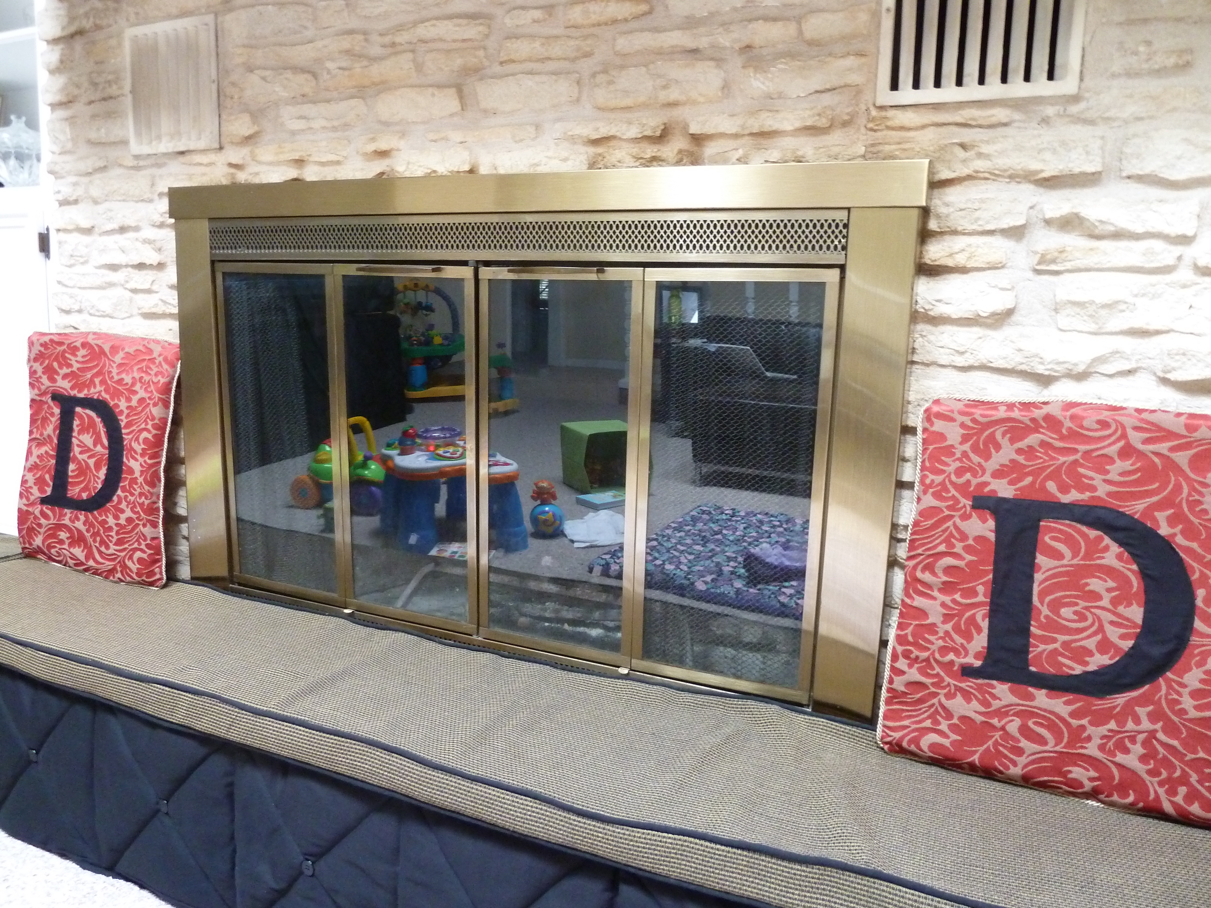 Hubs and I decided that we needed more seating and the fireplace was a great option but not with stone sticking you in the rump!  So I made some cushions to add more seating and added a faux tufted cover for the front and side of the fireplace.  The monogramed pillows are great for back support and I really like the monogram.  I have a tutorial for the monogramed pillows here.  I kept the seating cushions neutral so I could change out the pillows with different colors if I pleased and I found it on sale for $4 a yard!