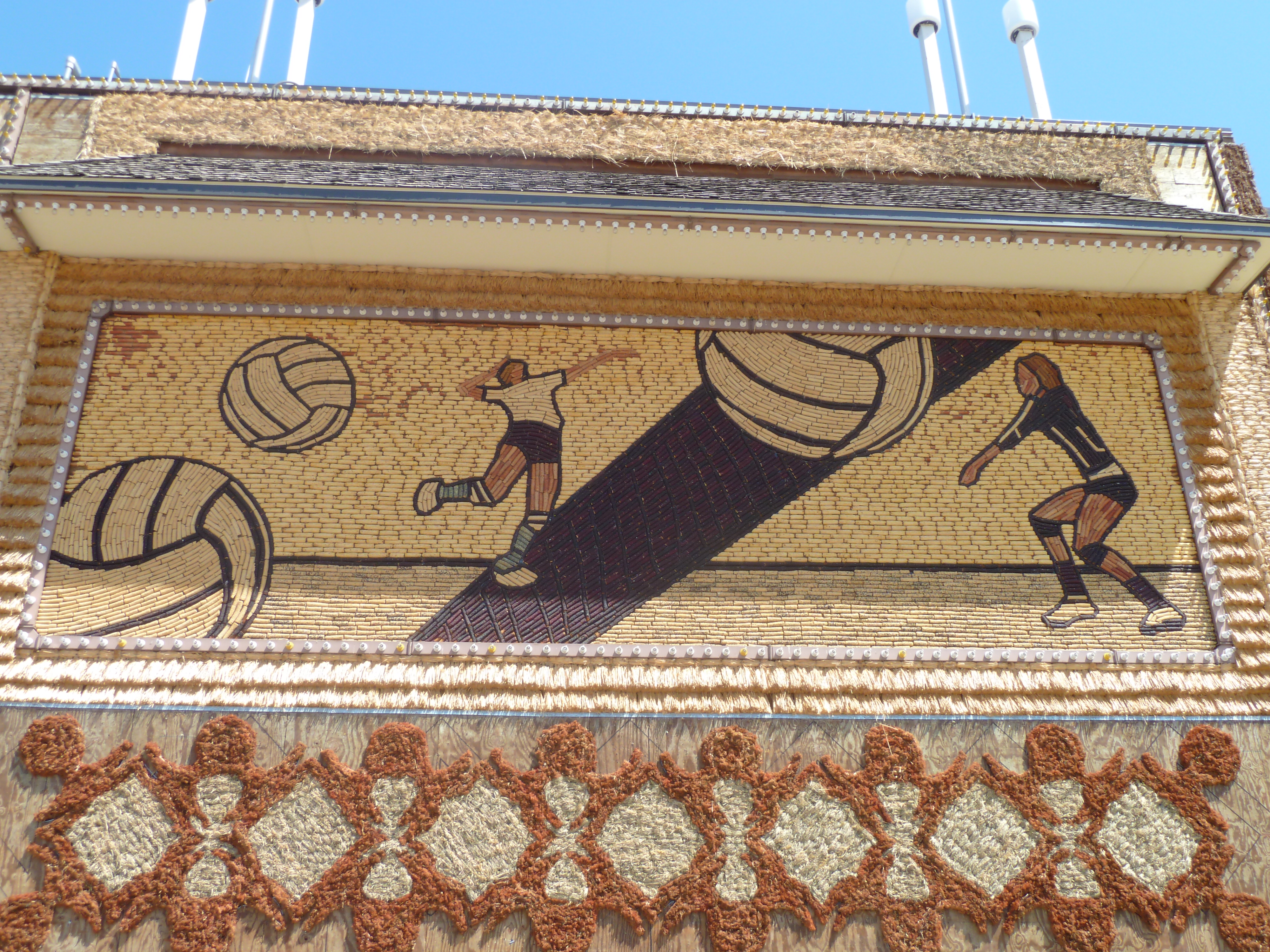Each year they have a theme and create designs made of corn husks on the outside to represent that theme.  This year happened to be youth sports so of course we had to find the volleyball mural and take a picture.