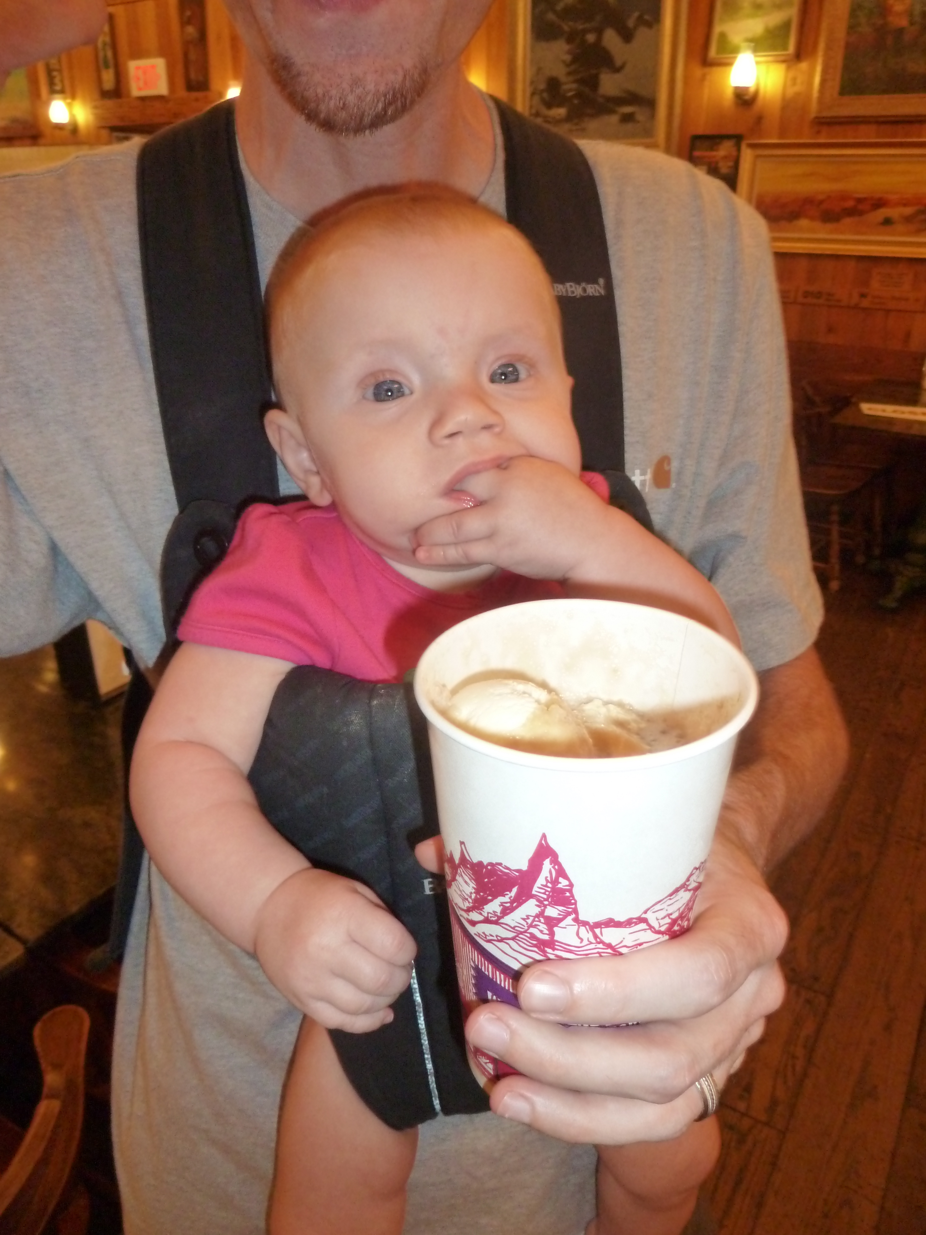 Next stop was Wall Drug Store in Wall, SD.  Not much else in the town but a street that looks like the old west covered with parked SUVs from all over the country.  We browsed the drug store and I found some inspiration for some new outfits to make for the little one and hubs found the soda shop.  I ordered up some root beer floats from a Slovenian girl behind the counter.  The drug store participates in a work across America program and pretty much everyone working in the shop was from another country.