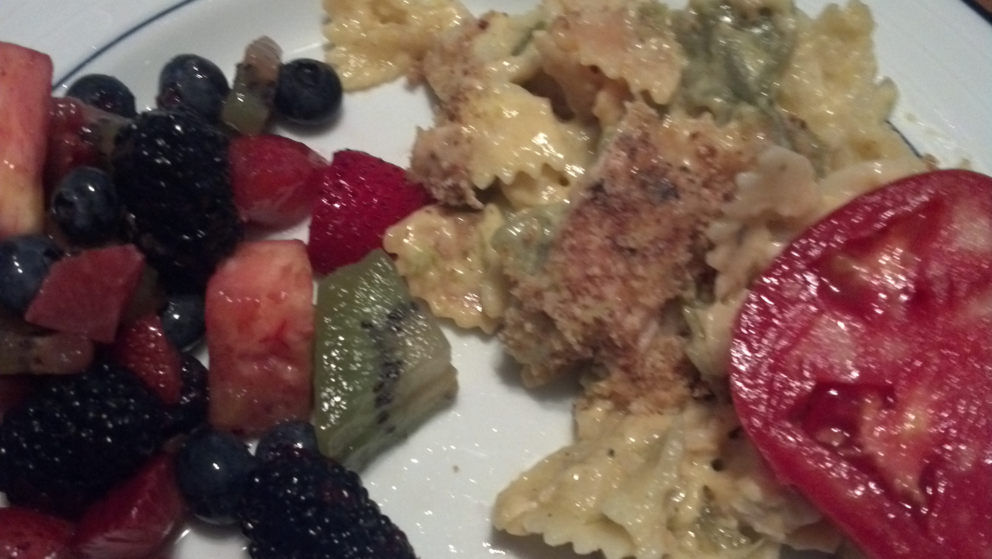 Dice chicken, and toss with pasta and cheese.  Place in a baking dish and cover with bread crumbs.  Bake for 15-20 minutes until bubbly.