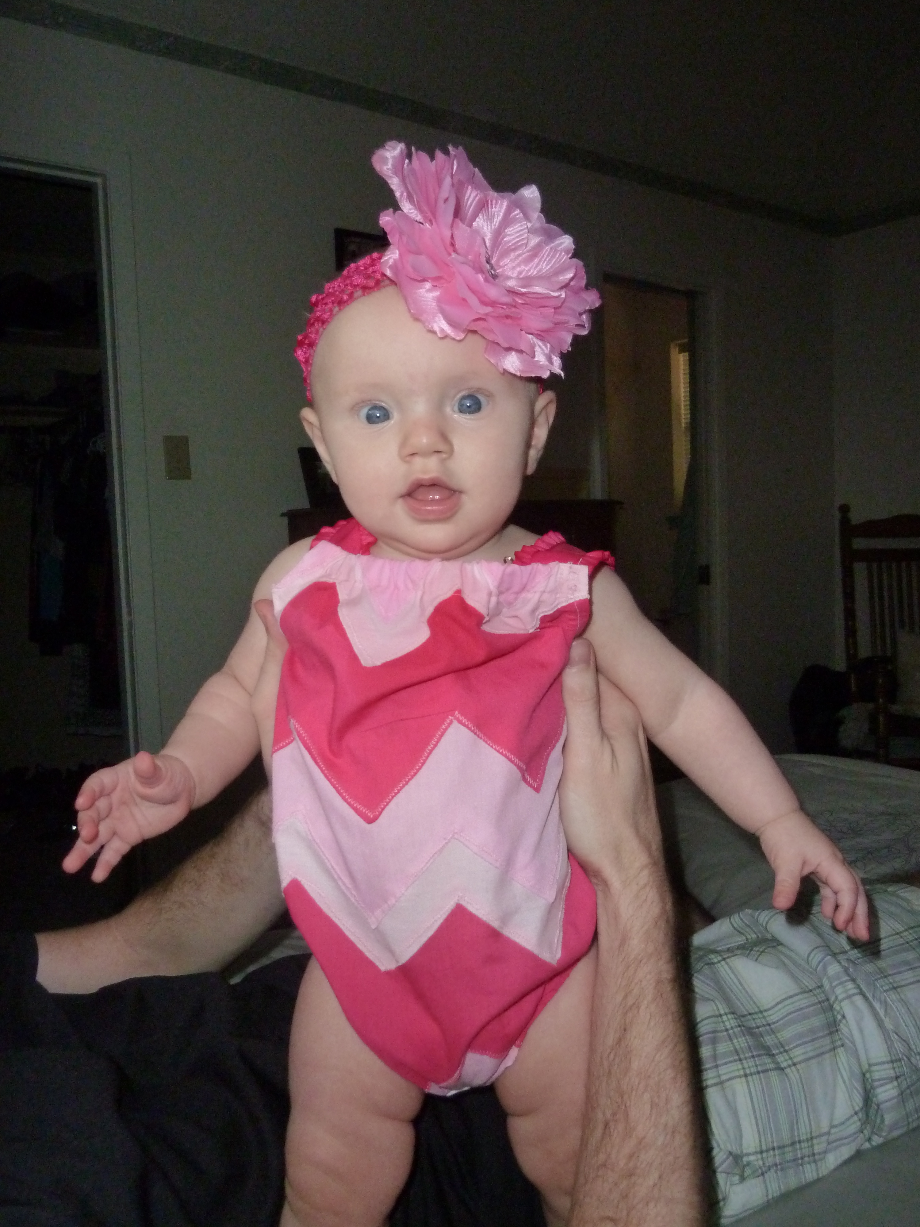 I sewed each of those zig zags together and made my own bubble pattern.  Still needs some work but I think it turned out cute and with an obnoxiously large flower who doesn’t think she is the cutest baby ever!  Of course mom is biased.  Also I think this is the only time in life that fat rolls are cute!