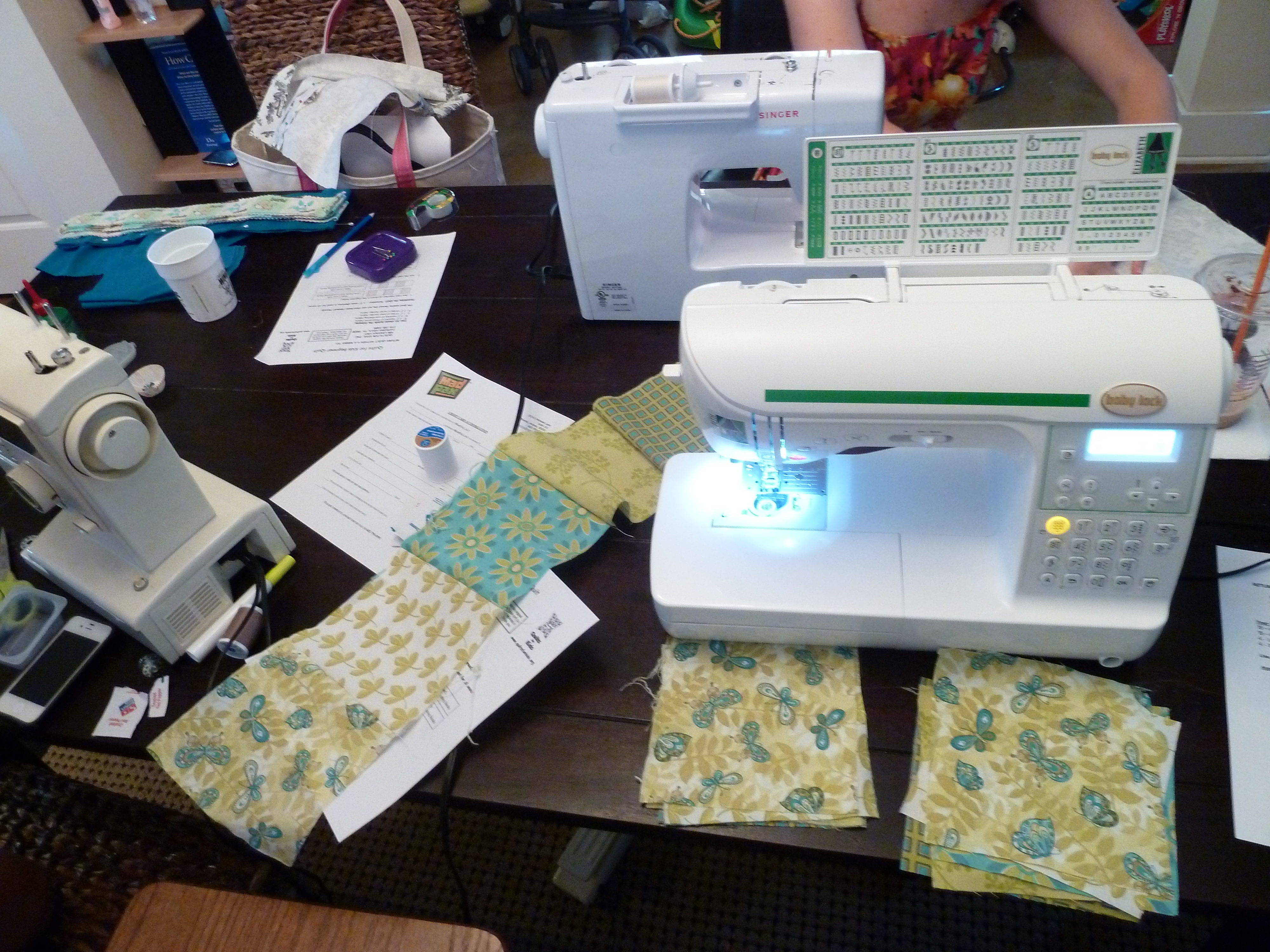 The second sewing circle had a quilt theme! Now none of us had ever quilted but this sounded pretty easy. Just sew a bunch of squares together, right? So we ordered pizza and the machines were humming. Now Cara’s machine made more of clunk clunk sound so we decided she would cut and I would sew. Here is the vintage beauty!